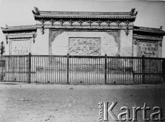 1913, Urga/Ułan Bator, Mongolia. Zabudowania jednej ze świątyń buddyjskich, na pierwszym planie z lewej jampaj - ściana pokryta płaskorzeźbami, która ma osłaniać świątynię od złych duchów. Zdjęcie pochodzi z albumu z podróży Zdzisława i Konstancji Poklewskich-Koziełł, Janusza i Natalii Łosiów oraz Stanisława i Julii Rosenwerthów do Mongolii w 1913 roku. Fot. Zdzisław Poklewski-Koziełł, zbiory Ośrodka KARTA, przekazała Hanna Kunachowicz