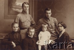 1917-1918, Rosja. Rodzina Grabowskich przymusowo ewakuowana z Gucina [pow. Łomża] do Czernihowa, gdzie wszyscy wstąpili do Centralnego Komitetu Obywatelskiego. Siedzą od lewej: Kazimiera Grabowska, Stanisław Grabowski, Halina Żero (Burówna, dziecko adoptowane), Michalina Grabowska [kierowniczka ochronki w Czernihowie, potem w Lubeczu], stoją: Franciszek (z lewej) i Wacław Grabowscy. Fot. NN, zbiory Ośrodka KARTA, udostępniła Halina Żero.