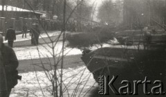 22.07.1945, Berlin, Niemcy. Przejazd czołgów podczas Wielkiej Zwycięskiej Defilady, w której uczestniczył Winston Churchill. Na pierwszym planie - żołnierze obserwujący defiladę, w oddali widoczna jest Siegessaule - pruska kolumna zwycięstwa. Fot. NN, zbiory Ośrodka KARTA, udostępnili Katarzyna i Tomasz Krzywiccy