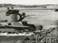 Wrzesień 1939, Polska. Kampania wrześniowa, wkroczenie oddziałów niemieckich do Polski. Niemieccy żołnierze oglądają zniszczony czołg. Fotografia wykonana przez nieznanego żołnierza Wehrmachtu. Fot. NN, Instytut Polski im. Gen. Sikorskiego w Londynie [teczka nr 140a]
