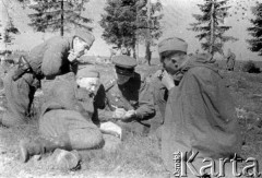 Maj 1944, Cassino, Włochy. Bitwa pod Monte Cassino, czołgiści spożywający posiłek obok swojego czołgu, pod siatką maskującą. Fot. T. Szumański, Instytut Polski im. Gen. Sikorskiego w Londynie [album negatywowy nr 105]