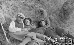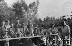 Wiosna 1940, Południewica, obwód Gorki, ZSRR Wyrąb lasu w spec posiołku Południewica, siedzą od lewej: Irena Królówna, Alinka Domagalska, Janina Sidorska, Teresa Domagalska, Hanka Porajska, Renia Królówna, Bogda Krupska, Alicja Godowska (najmłodsza w grupie), stojace kobiety: Kazia Warzyńska, Halina Karczmarska, Zocha NN, Jaga Sitanska, mężczyźni: Kazik Olszewski, Stach Boryń, Wojtek Morawski, Stach Byczek, Alek Miłaszewski, Andrzej Porajski. Fot. NN, zbiory Ośrodka KARTA, udostępniła Alicja Dymecka.