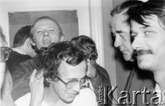 Październik 1980, Warszawa, Polska. Bankiet w mieszkaniu Elżbiety i Pawła Bąkowskich z okazji 100 publikacji Niezależnej Oficyny Wydawniczej NOWA, Karol Modzelewski, Wiktor Woroszylski i Krzysztof Śliwiński. Fot. Tomasz Abramowicz, zbiory Ośrodka KARTA