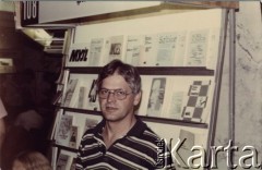Maj 1989, Warszawa, Polska. Wiktor Mikusiński jako przedstawiciel Wydawnictwa MYŚL podczas Międzynarodowego Dnia Książki, w którym po raz pierwszy uczestniczyli wydawcy niezależni. Fot. NN, zbiory Ośrodka KARTA, udostępnił Wiktor Mikusiński