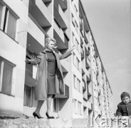 Marzec 1960, Kraków Nowa Huta, Polska. Kobieta idzie po murze, w tle blok, z prawej dziecko. Fot. Romuald Broniarek/KARTA