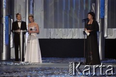 03.03.2003, Warszawa, Polska. Gala Nagród Akademii Telewizyjnej Wiktory 2002 w Teatrze Wielkim, n/z od lewej: Maciej Stuhr, Magda Mołek, Ewa Drzyzga. Fot. Artur Polit, zbiory Fundacji Ośrodka KARTA