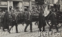 18.05.1935, Kraków, Polska. Pogrzeb Marszałka Józefa Piłsudskiego - kondukt pogrzebowy. Aleksandra Piłsudska z domu Szczerbińska oraz generał Edward Rydz-Śmigły maszerują za trumną ustawioną na lawecie. W tle - żołnierze oraz ludność cywilna obserwująca wydarzenie. Fot. NN, zbiory Ośrodka KARTA, kolekcję zdjęć przekazał Marcin Jabłoński.