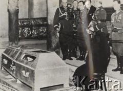 18.05.1935, Kraków, Polska. Pogrzeb Marszałka Józefa Piłsudskiego. Aleksandra Piłsudska siedzi przy trumnie męża, za nią stoją generał Edward Rydz-Śmigły i generał Tadeusz Kasprzycki. W tle - kolumny i sarkofagi krypty kaplicy św. Leonarda na Wawelu. Fot. NN, zbiory Ośrodka KARTA, kolekcję zdjęć przekazał Marcin Jabłoński.