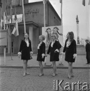 Kwiecień 1969, Inowrocław, Polska. VIII Konkurs Piosenki Radzieckiej, eliminacje do Festiwalu Piosenki Radzieckiej, żeński zespół wokalny na tle Teatru Miejskiego. Fot. Romuald Broniarek, zbiory Ośrodka KARTA.