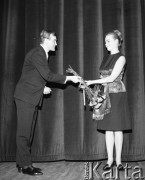 1965, Warszawa, Polska. Kino "Skarpa" - premiera radzieckiego filmu pt. "Opowieści znad Donu", Mieczysław Kalenik wręcza bukiet goździków Ludmile Czursinej. Fot. Romuald Broniarek/KARTA