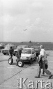 10.09.1989, Warszawa - Bemowo, Polska. Lotnisko na Bemowie, giełda samochodowa, dwaj mężczyźni toczący koła do samochodu, w górze lecący samolot. Fot. Jarosław Tarań, zbiory Ośrodka KARTA [89-38]
