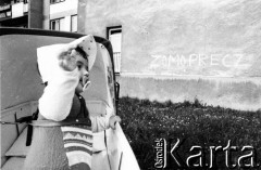 Lata 90., Kraków, Polska. Napis na murze. Na zdjęciu meżczyzna w płaszczu. Fot. Piotr Dylik, zbiory Ośrodka KARTA