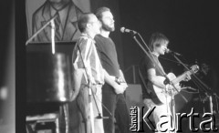 20-22.08.1981, Gdańsk, Polska. I Przegląd Piosenki Prawdziwej (reżyseria Marek Karpiński, scenografia Andrzej Czeczot). Na zdjęciu od lewej Jan Tadeusz Stanisławski, Krzysztof Jaroszyński i Maciej Zembaty. Fot. Zbigniew Trybek, zbiory Ośrodka KARTA
