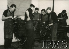 1940-1941, Münchenbuchsee, Szwajcaria. Żołnierze z 2. Dywizji Strzelców Pieszych podczas internowania. Od lewej: sierżant Aleksander Ksyk, NN, kanonier Adam Gołąb, starszy strzelec Kazimierz Gierdal, starszy ogniomistrz Władysław Gutowski "Giorgio". Fot. Jerzy Konrad Maciejewski, zbiory Ośrodka KARTA