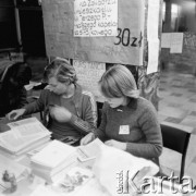 16.02.1981, Warszawa, Polska. Strajk studentów Akademii Medycznej w sprawie rejestracji Niezależnego Zrzeszenia Studentów. Punkt informacyjny. Druga od prawej strony siedzi Anna Bazydło. Ogłoszenia o następującej treści: "Bibuła do sprzedania (wpływy na fundusz strajkowy)" oraz "Spotkania dla młodzieży medycznej w soboty o godzinie 18 przy parafii Św. Stanisława Kostki na Żoliborzu w mieszkaniu księdza Jerzego Popiełuszki". Fot. Adam Szymański, zbiory Ośrodka KARTA, kolekcję zdjęć przekazał Adam Szymański