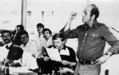 1980-1981, Dąbrowa Górnicza, Polska. Jacek Kuroń na spotkaniu z robotnikami, za stołem od lewej siedzą: Lech Wałęsa i Andrzej Celiński. Fot. NN, zbiory Ośrodka KARTA (z archiwum rodzinnego Jacka Kuronia)