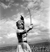 18.08.1968, Polska. Film "Pan Wołodyjowski", reż. Jerzy Hoffman - plan filmowy. Odtwórczyni roli Barbary Jeziorkowskiej - Magdalena Zawadzka - z szablą w dłoni. Fot. Jarosław Tarań, zbiory Ośrodka KARTA