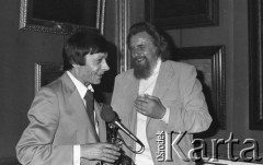 6.06.1981, Warszawa, Polska. Wizyta Czesława Miłosza w Polsce po otrzymaniu Literackiej Nagrody Nobla - spotkanie z poetą w Pałacu na Wodzie w Łazienkach Królewskich. Na pierwszym planie: Czesław Miłosz i Józef Tejchma, minister kultury i sztuki. W drugim rzędzie siedzi (drugi od prawej) Jerzy Turowicz, redaktor naczelny "Tygodnika Powszechnego", NN i Jerzy Puciata, malarz. W trzecim rzędzie siedzą (od lewej strony): pisarz Tadeusz Konwicki, aktor Gustaw Holoubek, reżyser Jerzy Kawalerowicz. Fot. NN, zbiory Ośrodka KARTA/Independent Polish Agency (IPA) przekazał Józef Lebenbaum