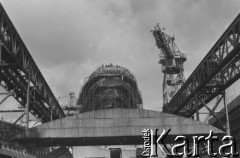 Około 1966, Gdańsk, Polska. Stocznia Gdańska (od 15.04.1967 Stocznia Gdańska im. Lenina). Budowa statku na jednej z pochylni. Na zdjęciu stoczniowe żurawie. Fot. Edward Grochowicz, zbiory Ośrodka KARTA.