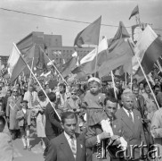1.05.1959, Warszawa, Polska. Obchody święta 1 Maja, ulica Marszałkowska, obcokrajowcy idący w pochodzie, w oddali powiewają flagi PRL i ZSRR, na budynku wiszą portrety Karola Marksa i Fryderyka Engelsa. Fot. Romuald Broniarek, zbiory Ośrodka KARTA