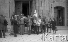 16.09.1981, Zakopane, Polska. Pogrzeb Stanisława Tora. Przed kościołem stoją: Zygmunt Łenyk, Stanisław Palczewski (zasłonięty flagą), pani Małgorzata (przewodniczka Zygmunta Łenyka), Mieczysław Majdzik. Z kościoła wychodzi Kazimierz Świtoń. Fot. Romana Kahl-Stachniewicz, zbiory Ośrodka KARTA [1981-10]