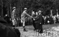 1986, Warszawa, Polska. Uroczystość odsłonięcia pomnika powstańców śląskich i wielkopolskich na Cmentarzu Wojskowym na Powązkach. Na zdjęciu delegacja przedstawicieli organizacji kombatanckich i harcerze. Fot. Edward Grochowicz, zbiory Ośrodka KARTA.