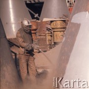 1968, Warszawa, Polska. Warszawskie Zakłady Maszyn Budowlanych im. Ludwika Waryńskiego, pracownica fabryki w kombinezonie obsługująca maszynę. Fot. Jarosław Tarań, zbiory Ośrodka KARTA