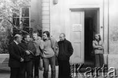 Październik 1979, Warszawa, Polska. Głodówka członków Komitetu Obrony Robotników w kościele św. Krzyża, stoją od lewej: Kazimierz Janusz, Jerzy Markuszewski, Adam Michnik, Mariusz Wilk, ksiądz Stanisław Małkowski, kobieta NN. Fot. Janusz Krzyżewski, zbiory Ośrodka KARTA