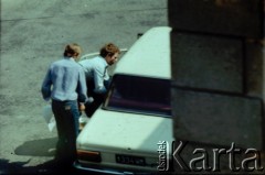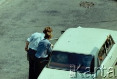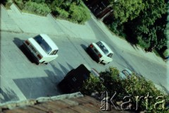 29.05.1979, Warszawa, Polska. Samochód funkcjonariuszy Służby Bezpieczeństwa, dokonujących rewizji w mieszkaniu Marcina Jabłońskiego, współpracującego z opozycją fotografa, kolportera prasy i wydawnictw niezależnych. Fotografia została wykonana z ukrycia, z dachu sąsiednego budynku na ulicy Pogonowskiego na warszawskim Żoliborzu. Fot. Witold Olszewski, zbiory Ośrodka KARTA (kolekcję przekazali Nina i Eugeniusz Smolarowie z wydawnictwa Aneks)