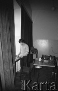 Listopad 1981, Warszawa, Polska. Uniwersytet Warszawski - strajk okupacyjny studentów solidaryzujących się ze studentami Wyższej Szkoły Inżynierskiej w Radomiu. Protestujący student rozmawia przez telefon. Fot. NN, zbiory Ośrodka KARTA/Independent Polish Agency (IPA) przekazał Józef Lebenbaum