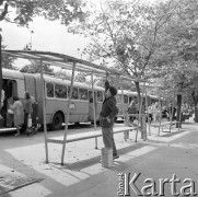 3-5.08.1981, Warszawa, Polska. Blokada ronda na skrzyżowaniu ulicy Marszałkowskiej i Alei Jerozolimskich. Kierowcy autobusów miejskich i ciężarówek w ten sposób protestowali przeciwko obniżce kartkowych przydziałów mięsa i trudnościom zaopatrzeniowym. Strajk został zorganizowany przez Zarząd Regionu Mazowsze NSZZ "Solidarność". Fot. Tomasz Tomaszewski, zbiory Ośrodka KARTA