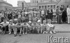 22.07.1959, Warszawa, Polska. Uroczyste obchody piętnastolecia PRL z udziałem Nikity Chruszczowa, I sekretarza KC KPZR. Grupa dzieci siedzi na chodniku przed Pałacem Kultury i Nauki. Fot. Romuald Broniarek/KARTA