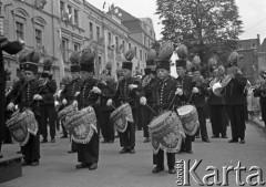 22.07.1959, Warszawa, Polska. Uroczyste obchody piętnastolecia PRL z udziałem Nikity Chruszczowa, I sekretarza KC KPZR. Orkiestra wojskowa: trębacze i bębniści. Fot. Romuald Broniarek/KARTA