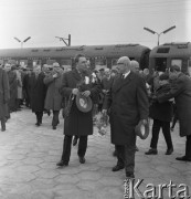 Kwiecień 1965, Warszawa, Polska. Wizyta radzieckich władz państwowych w 20. rocznicę zawarcia układu o przyjaźni między Polską a ZSRR - powitanie na dworcu kolejowym, na pierwszym planie Leonid Breżniew i Władysław Gomułka. Fot. Romuald Broniarek/KARTA