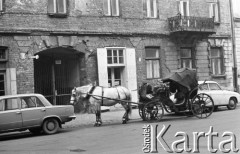 Czerwiec 1948, Cieplice Śląskie-Zdrój, woj. wrocławskie, Polska. Koń zaprzęgnięty do wozu. W głębi na ławce obok parku siedzą dwaj mężczyźni. Fot. Jerzy Konrad Maciejewski, zbiory Ośrodka KARTA