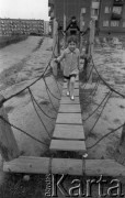 Lata 50., Bieszczady, Polska. Fragment bieszczadzkiej kolejki wąskotorowej, której budowę rozpoczęto w 1890 r. Zniszczona znacznie w czasie II wojny światowej. Jej rozbudowa była jedną z największych inwestycji powojennych na kolejach leśnych (stała się własnością Lasów Państwowych). Była wykorzystywana przez zakłady przetwórstwa drzewnego do przewozu drzewa. Fot. Jerzy Konrad Maciejewski, zbiory Ośrodka KARTA.
