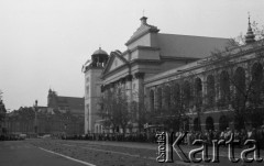 1969, Warszawa, Polska. Kobieta pozuje na tle figury św. Anny znajdującej się na lewo od kościoła św. Anny (kościoła Bernardynów) na Krakowskim Przedmieściu. Fot. Jerzy Konrad Maciejewski, zbiory Ośrodka KARTA