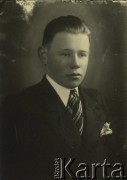 1939-1941, Kozienice, Polska. Portret młodego mężczyzny w białej koszuli i krawacie. Zdjęcie wykonane w atelier fotograficznym żydowskiego fotografa Chaima Bernemana. Przed wojną zakład mieścił się w Kozienicach na rogu ulic Warszawskiej i Maciejowickiej, przed wybuchem wojny albo już w czasie niemieckiej okupacji został przeniesiony na ulicę Lubelską 13. Cała kolekcja jest datowana na okres od drugiej połowy lat 30-tych do roku 1941, kiedy Chaim Berneman wraz z rodziną został zesłany do obozu pracy w Wolanowie. Berneman zmarł po ucieczce z obozu. Fot. Chaim Berneman (Chaim Berman), zbiory Ośrodka KARTA