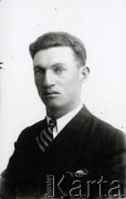 Druga połowa lat 30. do 1941, Kozienice, Polska. Portret młodego mężczyzny w marynarce, jasnej koszuli i krawacie. Zdjęcie wykonane w atelier fotograficznym żydowskiego fotografa Chaima Bernemana. Przed wojną zakład mieścił się w Kozienicach na rogu ulic Warszawskiej i Maciejowickiej, przed wybuchem wojny albo już w czasie niemieckiej okupacji został przeniesiony na ulicę Lubelską 13. Cała kolekcja jest datowana na okres od drugiej połowy lat 30-tych do roku 1941, kiedy Chaim Berneman wraz z rodziną został zesłany do obozu pracy w Wolanowie. Berneman zmarł po ucieczce z obozu. Fot. Chaim Berneman (Chaim Berman), zbiory Ośrodka KARTA