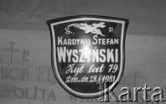 31.05.1981, Warszawa, Polska. Pogrzeb Kardynała Stefana Wyszyńskiego. Krypta zmarłego. Napis na tabliczce: "Ś.P. Kardynał Stefan Wyszyński, żył lat 79, zm. dn. 28 V 1981". Fot. NN, zbiory Ośrodka KARTA/Independent Polish Agency (IPA) przekazał Józef Lebenbaum