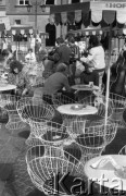 12.10.1968, Warszawa, Polska. Prezentacja kolekcji płaszczy poznańskiej "Modeny" na tarasie dachu Domu Towarowego "Smyk". Modelka w dwurzędowym płaszczu z futrzanym kołnierzykiem stoi obok stolików z krzesłami. Fot. Jarosław Tarań, zbiory Ośrodka KARTA