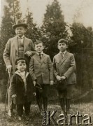 Ok. 1929, Olszanka, woj. warszawskie, Rzeczpospolita Polska. Rodzice Larysy Zajączkowskiej, Piotr (z prawej) i Elżbieta (w środku) i przyjacieelm rodziny na spacerze po lesie. Obok nich stoi pies Reks. Fot. NN, kolekcja Larysy Zajączkowskiej-Mitznerowej, zbiory Ośrodka KARTA
