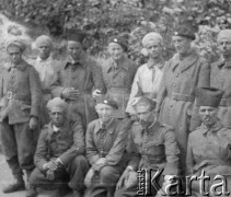 Maj 1944, Cassino, Włochy. Kwatera Dywizji 2 Korpusu, gen. Władysław Anders siedzi z grupką korespondentów prasowych przed namiotem, obok niego siedzi major Józef Czapski, stoi ppor. Eugeniusz Lubomirski z kartką w ręku. Fot. Felicjan Maliniak, Instytut Polski im. Gen. Sikorskiego w Londynie [album negatywowy L-I Monte Cassino] - płachta 45