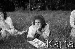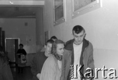 Wiosna 1990, Warszawa, Polska. Kampania wyborcza przed wyborami samorządowymi w dniu 27 maja 1990 roku. Młodzi ludzie stoją przy rzeźbie na fasadzie Pałacu Kultury i Nauki. Fot. Wojciech Druszcz, zbiory Ośrodka KARTA