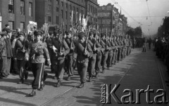 31.07.1955 - 4.08.1955, Warszawa, Polska. V Światowy Festiwal Młodzieży i Studentów o Pokój i Przyjaźń. Przemarsz uczestników spotkania. Fot. Irena Jarosińska, zbiory Ośrodka KARTA