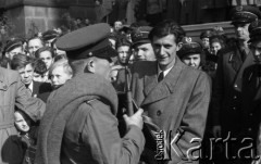 31.07.1955 - 4.08.1955, Warszawa, Polska. V Światowy Festiwal Młodzieży i Studentów o Pokój i Przyjaźń. Delegacja Grecji na jednej z warszawskich ulic. Fot. Irena Jarosińska, zbiory Ośrodka KARTA