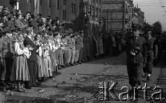 31.07.1955 - 4.08.1955, Warszawa, Polska. V Światowy Festiwal Młodzieży i Studentów o Pokój i Przyjaźń. Przemarsz zagranicznej delegacji przez jedną z warszawskich ulic. Fot. Irena Jarosińska, zbiory Ośrodka KARTA
