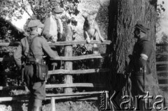 Maj-czerwiec 1944, Wileńszczyzna. Pluton zwiadu konnego 4 Bryg. Part. AK na zbiórce we wsi. Pierwszy z lewej dowódca plutonu ppor. Aleksander Czarnkowski "Ol". Z prawej odwrócony tyłem dowódca 4 Bryg. ppor. Longin Wojciechowski "Ronin". Fot. Sergiusz Sprudin [zbiór zdjęć Janusza Chorążaka nr. 59], zbiory Ośrodka KARTA