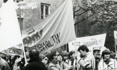 1982-89, Polska. Stan wojenny - manifestacja niezależna, widoczne transparenty z napisami "KPN", "Solidarność Walcząca". Fot. NN, zbiory Ośrodka KARTA (udostepniła Ita Wachowska)