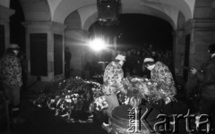1989, Polska. Demonstracja Niezależnego Zrzeszenia Studentów pod konsulatem ZSRR. Student zapala świeczki, w głębi kordon milicji. Fot. Piotr Dylik, zbiory Ośrodka KARTA